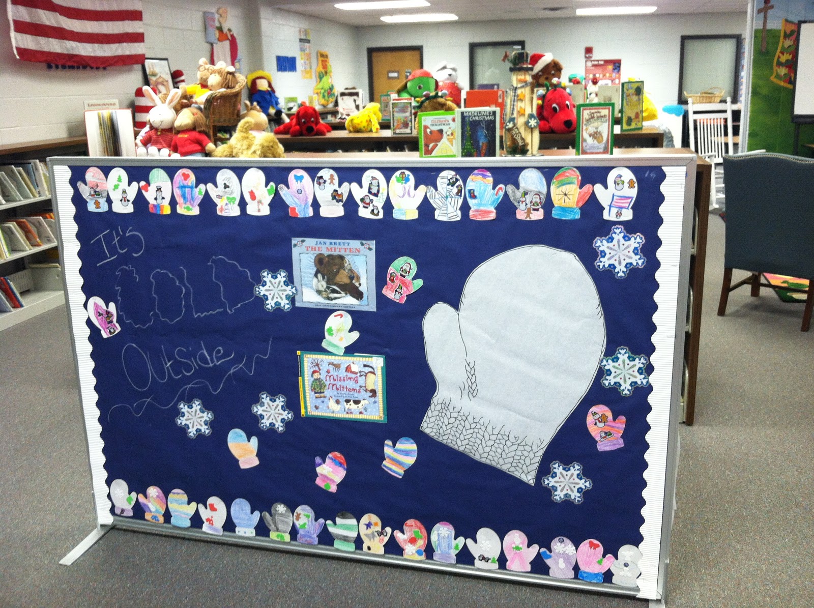 My story time this season is The Mitten and The Hat by Jan Brett. Even though our Library looks very Christmas festive, I like to use non-specific holiday books for my story time. The students are decorating white mittens (like the ones in the Mitten) and I am using them to decorate the library!